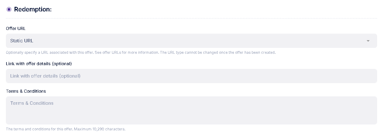 - Choose the Redemption method. The standard method includes a statis offer link and standard Terms and Conditions.