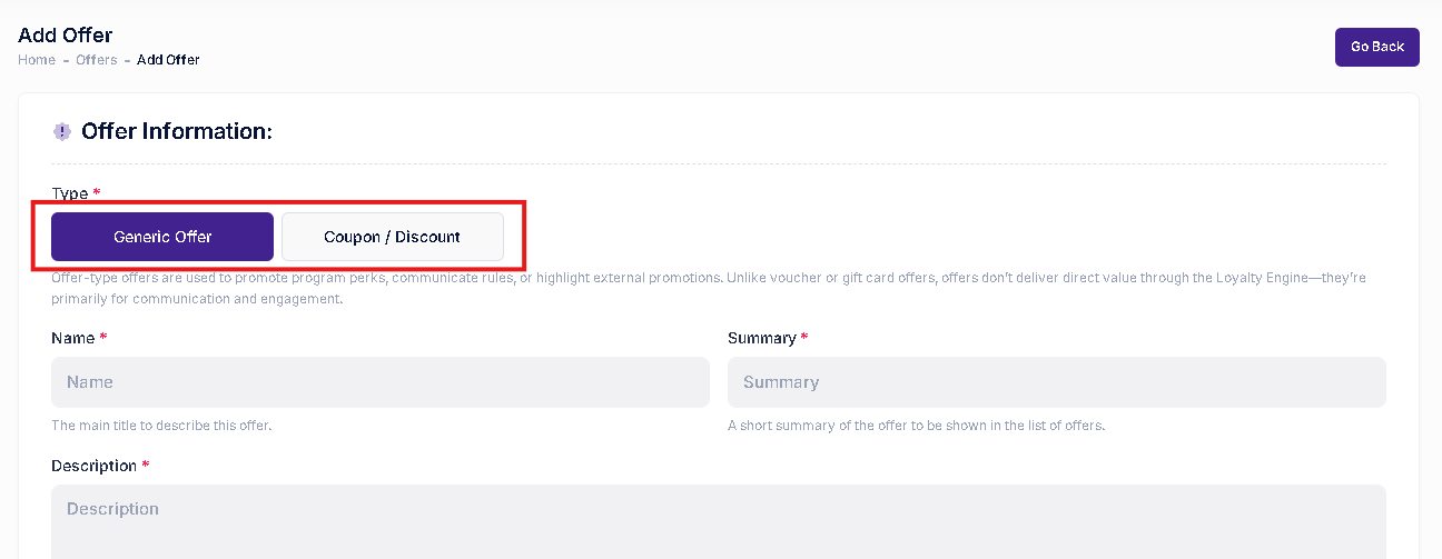 - Choose 'Generic Offer' or 'Coupon/Discount'