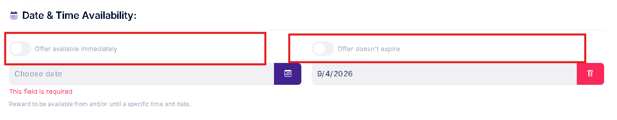 - Choose the start and end date. You also have options to move the toggles 'Offer available immediately' and 'Offer doesn't expire' if your Offer isn't time-restricted.