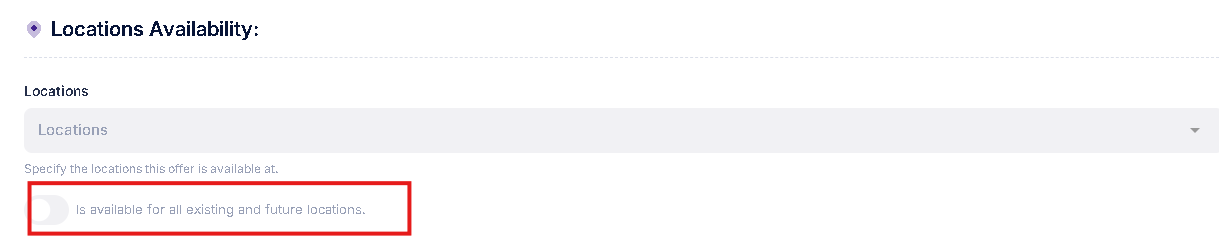 - Choose the 'Locations' your Offer will be available at. You can choose multiple locations, or you can also move the toggle 'Available for all existing and future locations'.